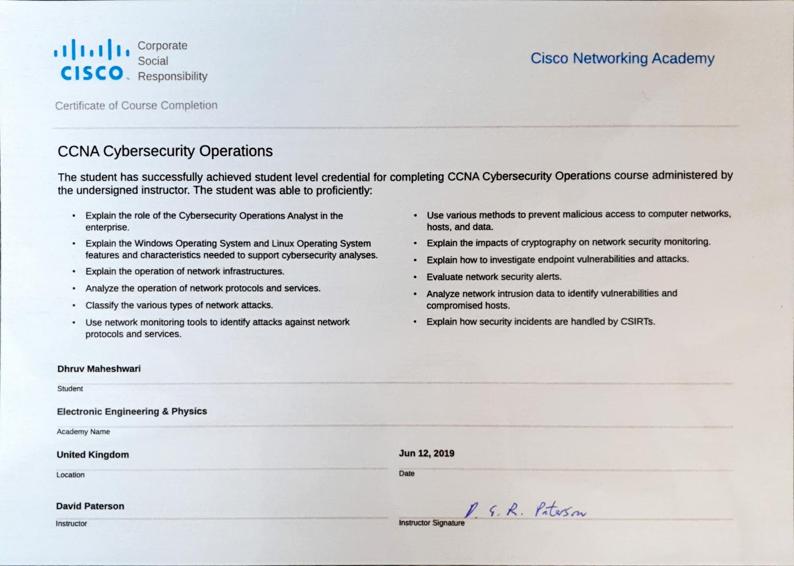 Above is given the Cyber Ops Certificate presented to him by David Paterson. Dhruv’s learning from the above course includes an understanding of the: